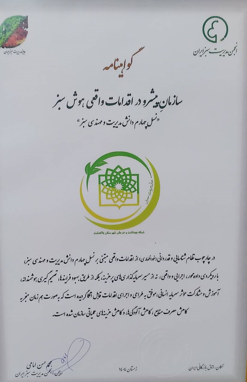 اعطای لوح هوش سبز به شبکه بهداشت و درمان پاکدشت